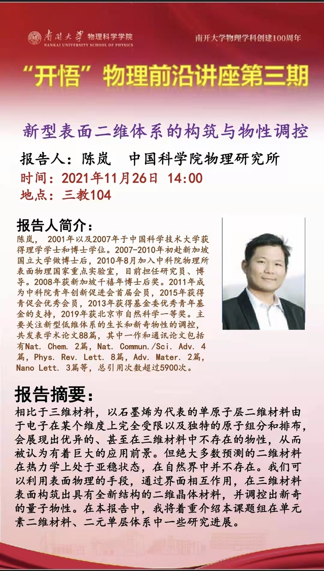 【“开悟”物理前沿讲座(第 3 期)】新型表面二维体系的构筑与物性调控